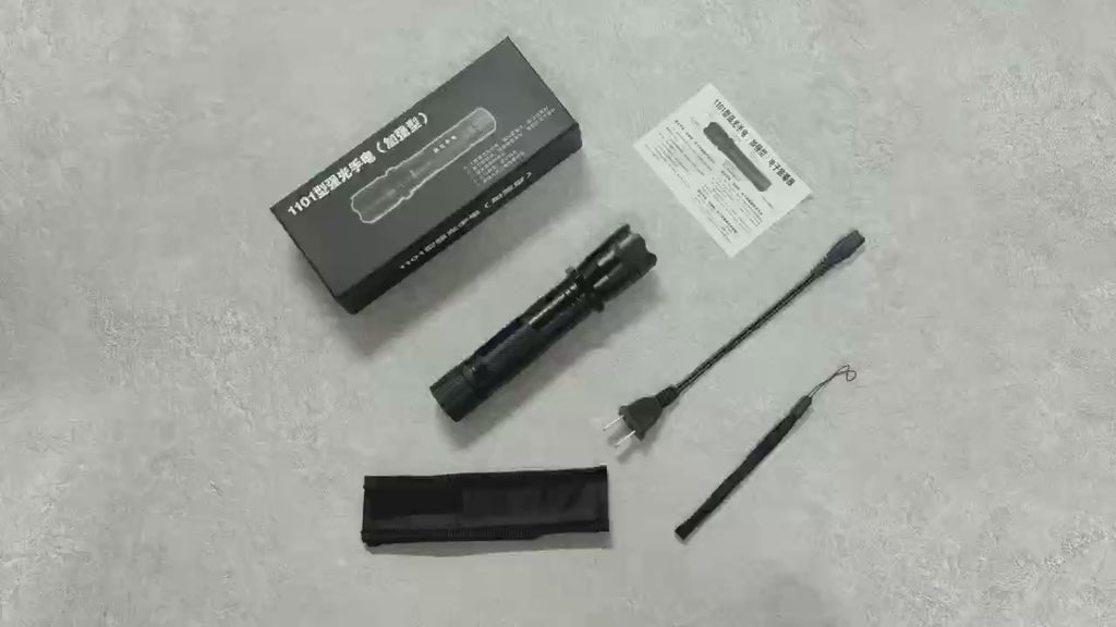🔥1101 Self-Defense Flashlight. Newly upgraded with strong beam, weak beam, and strobe modes. Classic black design, all-aluminum construction, adjustable lanyard, 17cm length, 195g weight. Includes a cloth cover. Product instruction manual included. New and existing customers are welcome to place orders.